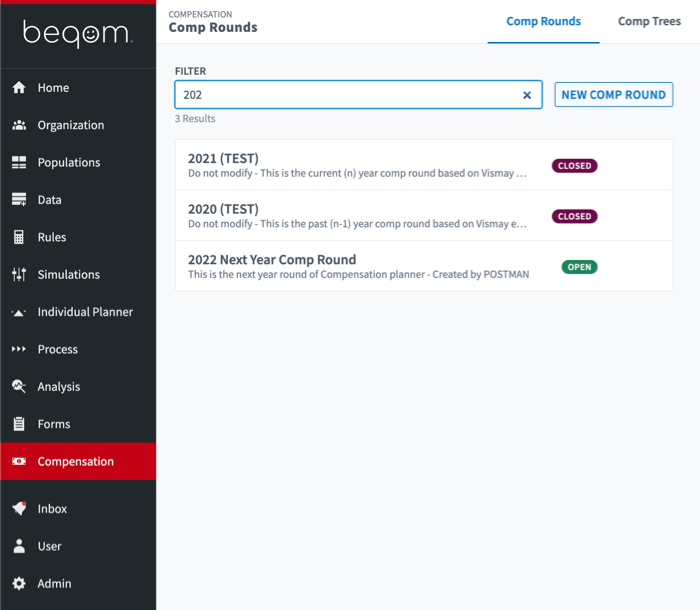 The Comp Rounds section: this section contains all existing compensation rounds, enables you to edit them or change their publication status, and also lets you create new compensation rounds (for more information, see Managing comp rounds)