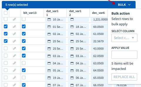 Click Replace All. The entered value is applied to the relevant field in all selected rows and the bulk apply tool is closed.