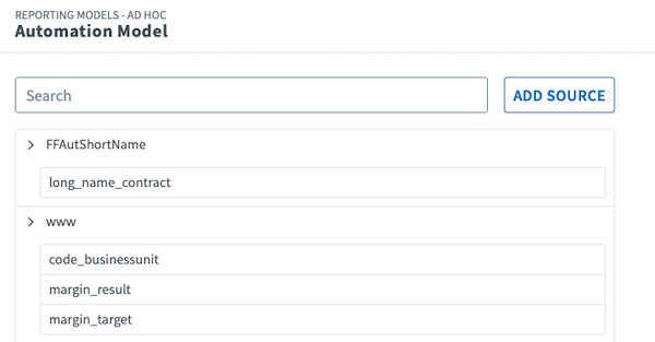 In the model configuration page, click the Add Source button, located at the right of the data source search field. The "Source from Table/View" contextual window is opened.