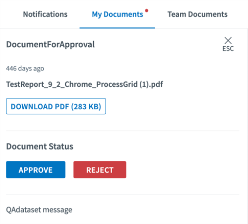 In the document action panel, click Approve or Reject, depending on the action that you want to perform, as illustrated in the following figure: