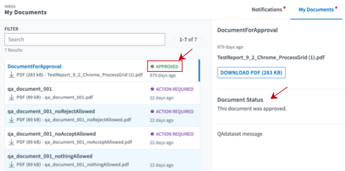 Once you have clicked a button, the button(s) disappear from the panel and the "Document Status" section is updated to reflect the action that has been performed. In addition, the status of the document in the document list is also updated to reflect your action, as illustrated in the following figure: