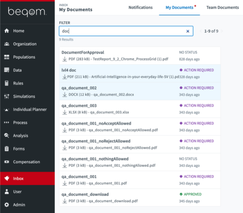 Documents are placed at your disposal by the system administrator. A validity period is linked to them; therefore, they will automatically disappear from the panel once validity end date has been reached. Depending on the configuration of the document, an action (approval or rejection) may or may not be required from you in the Inbox component. If no action is required, then you will only be able to download the document.