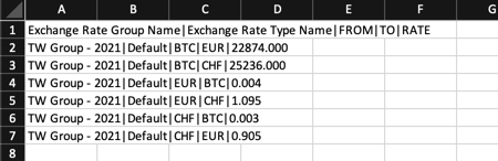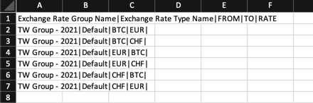 Click the Download Template button within the exchange rate type tab. The exchange rate file template is exported. The system generates an exchange rate file template according to the currencies that are included in the group, with the right combinations. If we take the example of a group with CHF, EUR and USD, then the file will look like the following figure: