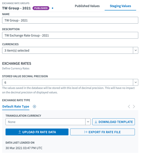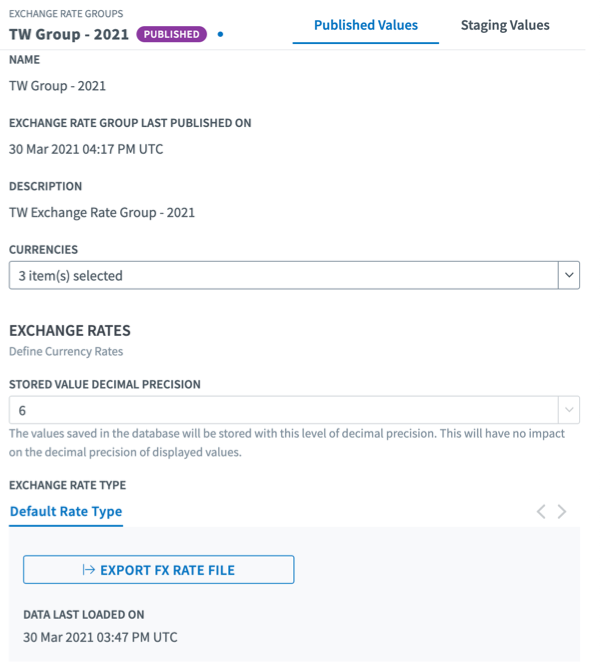 When an exchange rate group has been published ("Published" or "In Use" status; see About Exchange Rate Group Statuses) two views are available when opening the group: the "Published Values" view and the "Staging Values" view.
