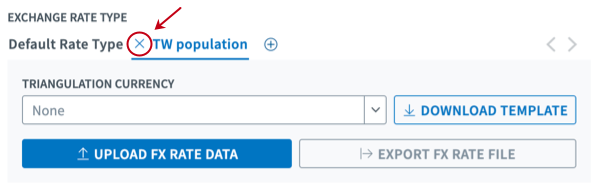 Click the name of the rate type that you want to remove. Once the item is active, a " x " icon is displayed at the left of exchange rate type name, as illustrated in the following figure: