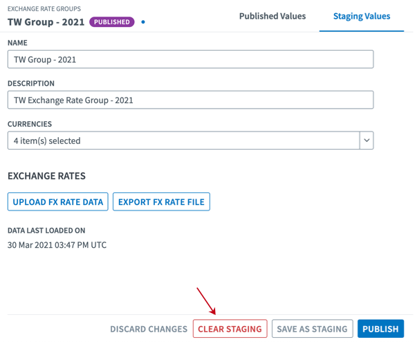 Open the exchange rate group that you want to configure (see Viewing an existing exchange rate group) and make sure that you are in the "Staging Values" area.