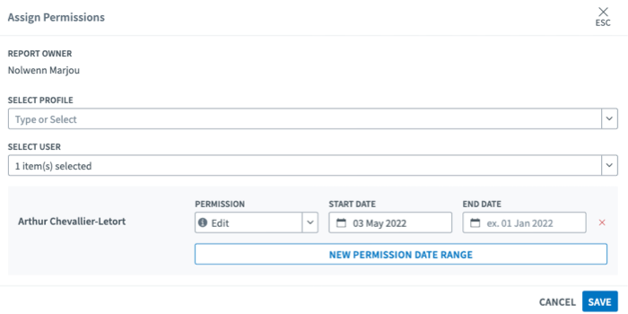 As the owner of an Advanced Analytics report, you have the possibility to share your report, either with all users belonging to a profile or with specific users. You can choose between three levels of permission that will determine the actions that can be performed by the persons with whom the report is shared, and you can and define one or several availability date range, as required.