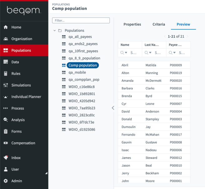 Open the "Preview" tab of the population details. This tab contains the full list of payees in the population, as illustrated in the following figure: