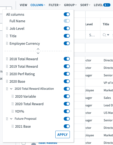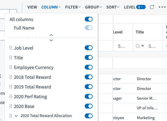Toggle the button of the columns that you want to display/hide. Toggle the All Columns button to select/unselect all the columns of the grid.