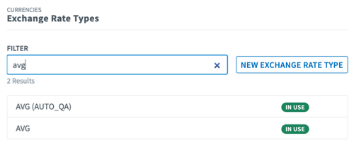In the component menu, located on the left of the screen, go to the Currencies & Rates section, and then click Exchange Rate Types. The list of exchange rate types currently defined in the application is displayed in the center panel, as illustrated in the following figure: