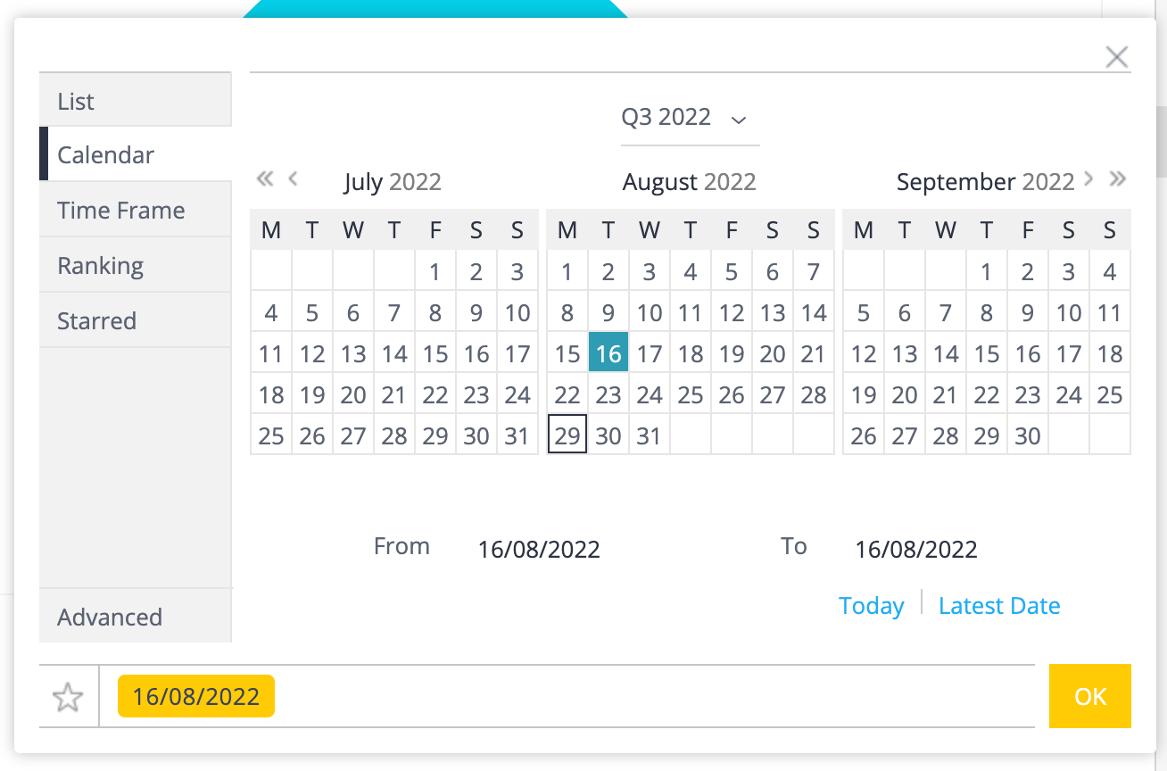 This filter enables you to define custom date ranges from a calendar tool. To define a calendar filter, proceed as follows: