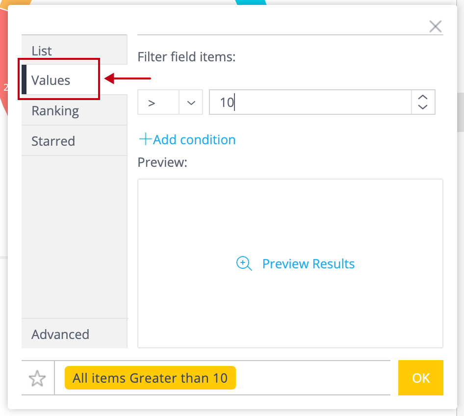 Values filter tab