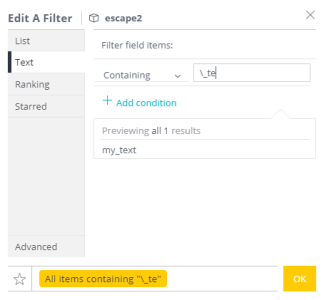 Escape characters: if you are searching for a string with a percent or an underscore, you can add a backslash (" \ ") in front of the character; Advanced Analytics considers the backslash as an escape character. For instance, if you want to search for results containing the string "_te" without considering " _ " as a wild car, use a backslash before the string, as illustrated in the following figure: