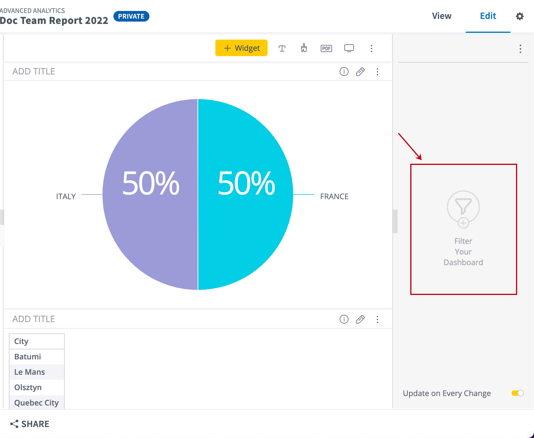 To enable/disable the automatic refresh of the dashboard when updating filters, change the state of the Update on Every Change toggle, located in the lower-right corner of the application window.