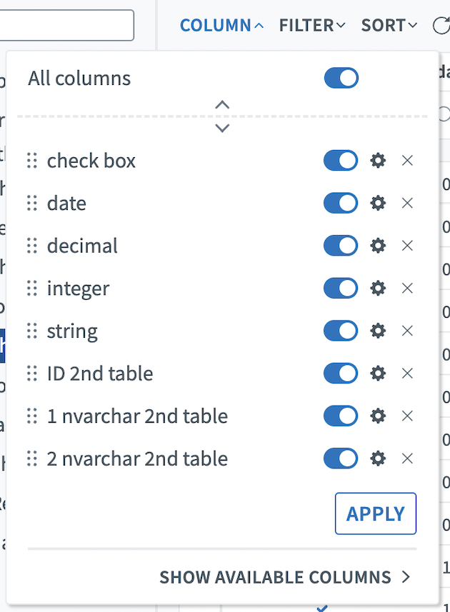 Toggle the All Columns button to select/unselect all the columns of the grid.