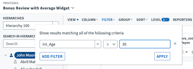 You can add as many filters as you want by clicking the Add Filter button and repeating the procedure above. However, please keep in mind that the "AND" operator is applied by default. In other words, when the filters are applied, the grid will display only the records that match all of the defined filters. Defined filters are retained for the hierarchy/process combination when you exit the screen.