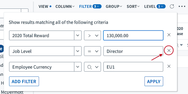 Click the " X " icon at the right of the filter, as illustrated in the following figure: