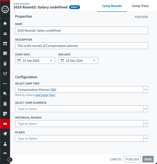 Once a comp round has been fully configured with all the required comp elements, permissions and exceptions, it can be published. Publishing a comp round means changing its status and making it available for use in the Individual planner.