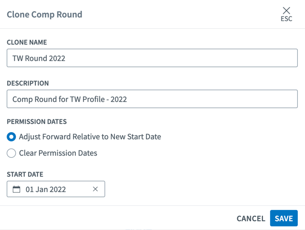 Adjust Forward Relative to New Start Date: if you check this button, then the dates of all the permissions defined in the original comp round will be adjusted according to the start date of the new comp round. In addition, when this option is selected, the End Date field (located at the bottom of the contextual window) is no longer displayed, because the date range (i.e., the duration of the round) of the original comp round is applied to the new comp round