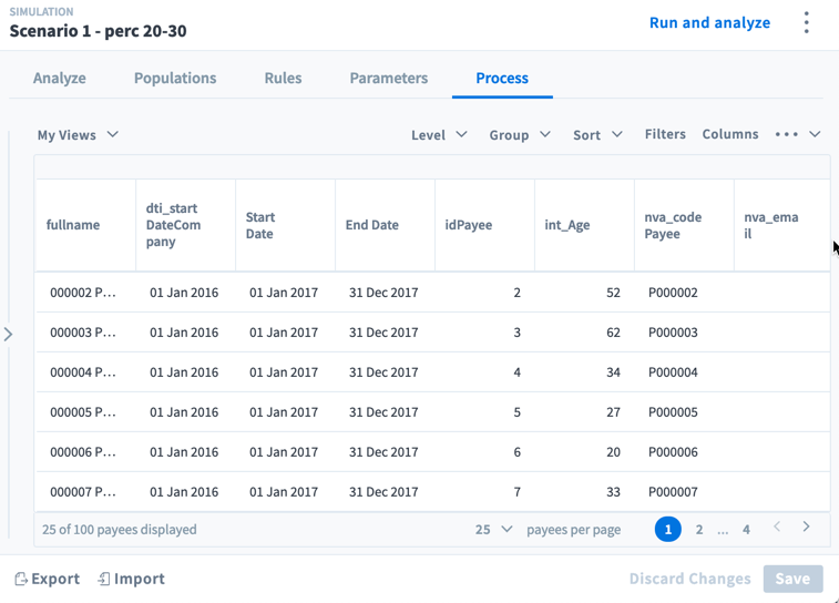 You can view the process grid attached to the simulation scenario in the "Process" tab and use most the same customization features (see Working with process grids) as in the "Rules" component, as well as the import and export features (see Importing Data Into a Process Grid and Exporting the Data of a Process Grid in Data management in process grids).